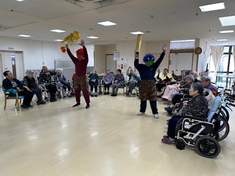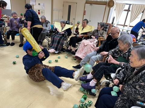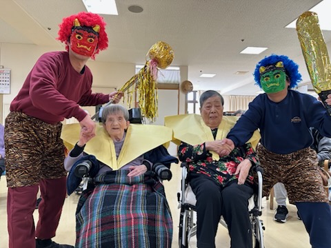 職員が鬼に扮して登場すると、利用者の皆さまから笑顔と笑い声があふれました。「鬼は外、福は内」と元気な声で豆をまき、無病息災を願いました。